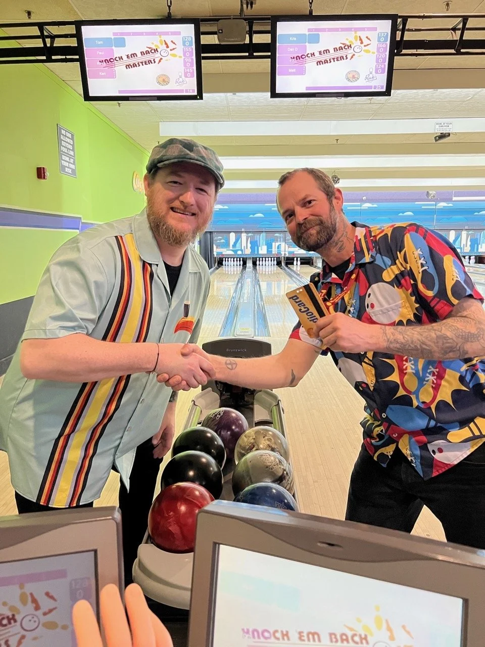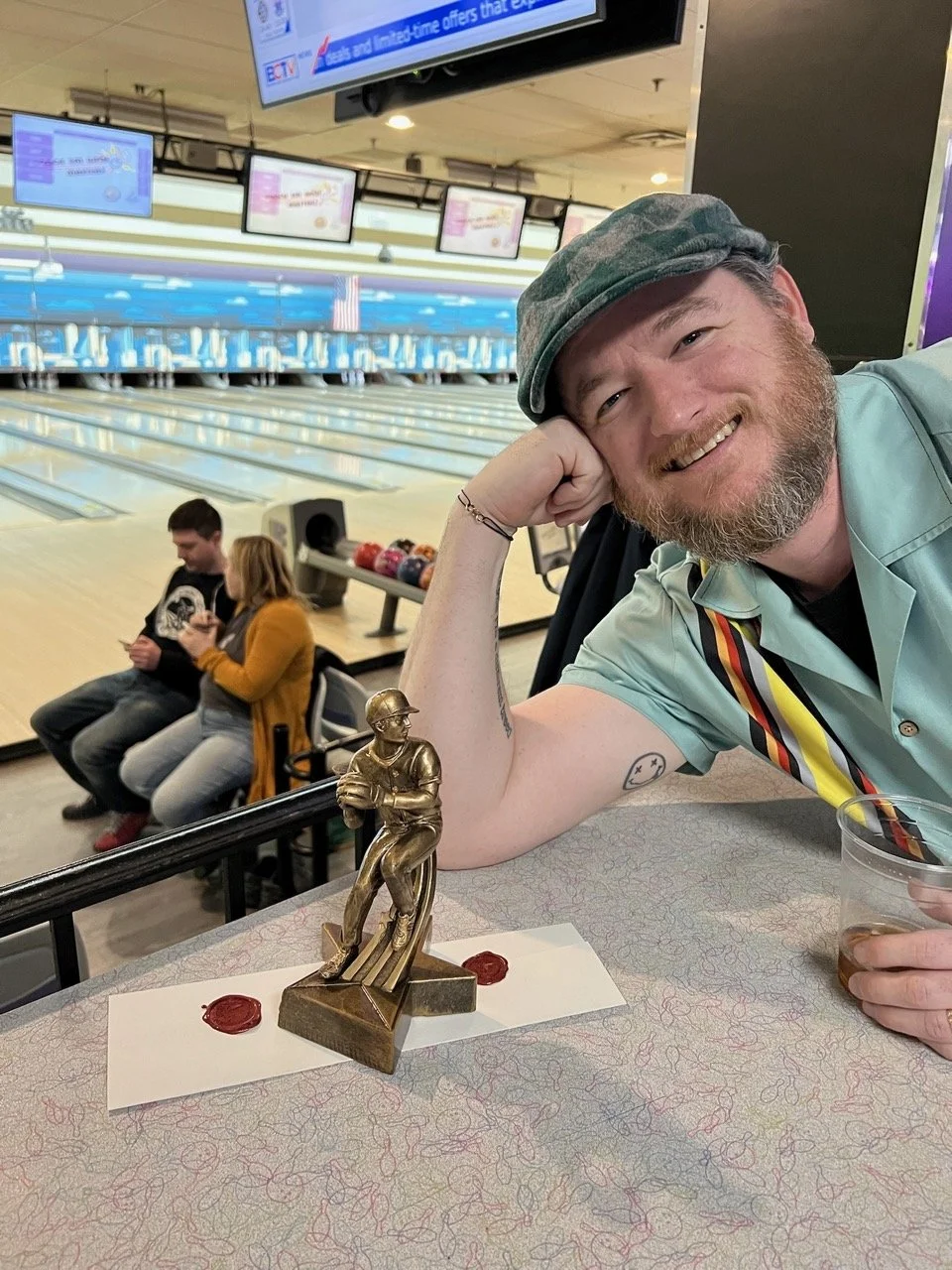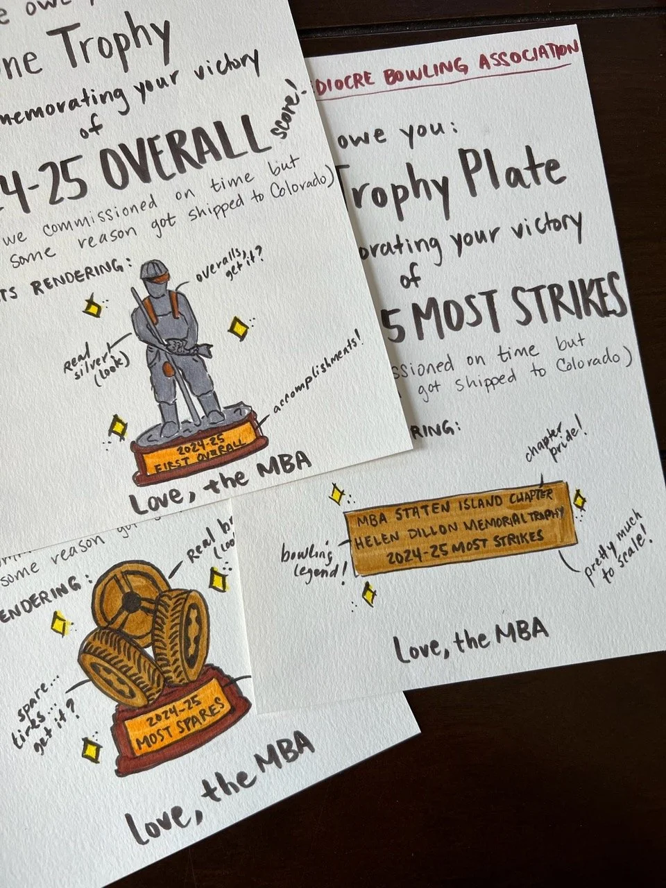 While Allyson Chiappi arrived just in time to receive her Spares trophy, before league co-commissioner Dan Derwin took it for himself, the trophies themselves did not. After a shipping mishap, the trophies for 1st Overall, Most Spares and plate for Most Strikes were errantly delivered to Colorado instead of New Brighton. League Artist in Residence, Hillary Scott created hand crafted IOUs to be handed out at the event.