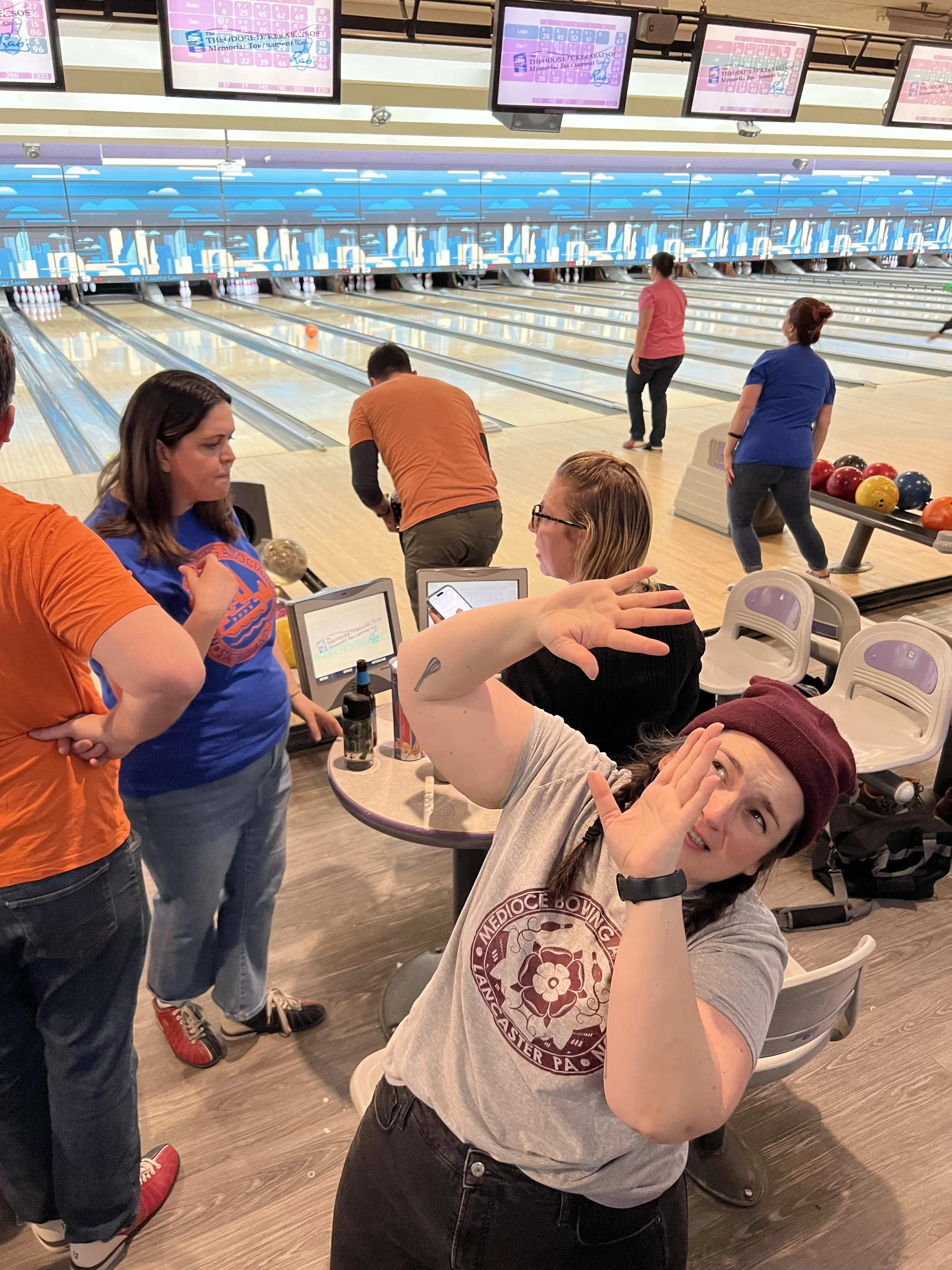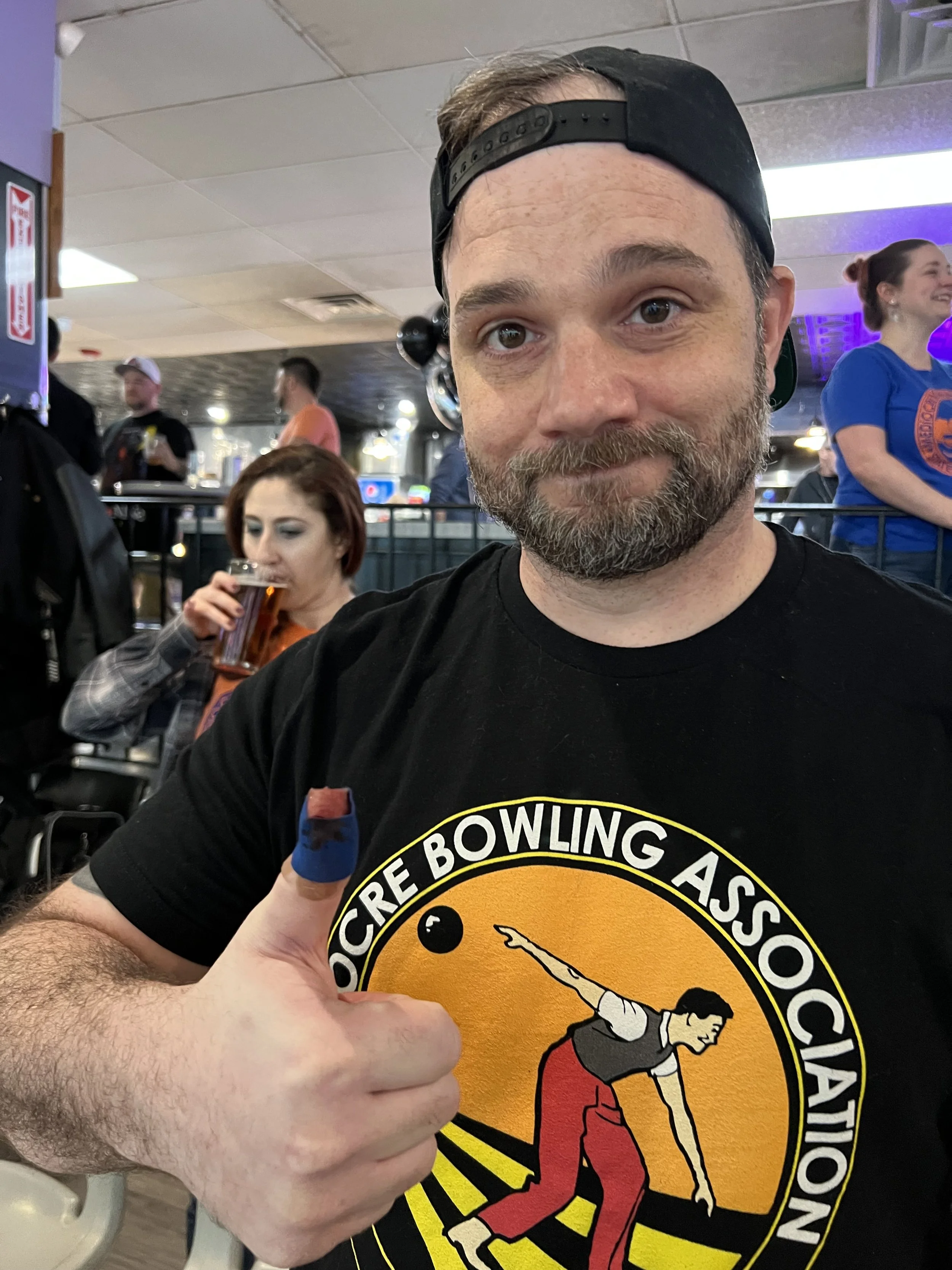In the cosmic zone, Jon Marotte on lane 20 was already off to a tumultuous start with an injured thumb that was openly bleeding. But while the injury was grisly, his bowling was on point with multiple strikes and spares in his first game and he powered through game one with a competitive score of 192, determined that this event would be the one he’d home the win. But Tom Ryan, 2025 T.D.K. Champ, on (cosmic) lane 21, threw a 174 and Keri Sheheen, on (cosmic) lane 19, was hot on their heels with a 172. The cosmic vibes were good!