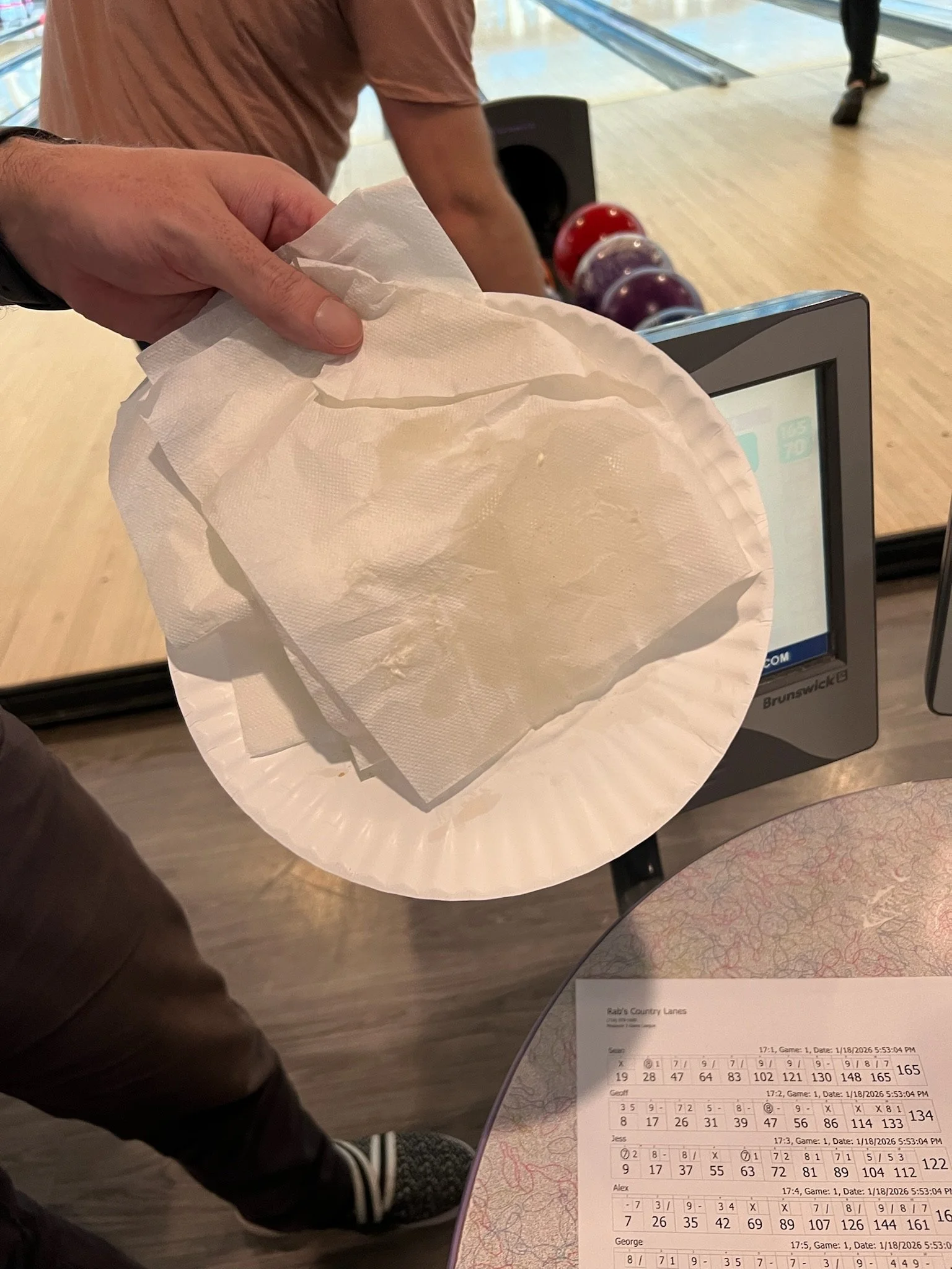 Leigh Jan Fran, returning from league maternity leave, and recruited by Captain Dan Derwin bowled a game one of 98 but found her stride in game two with a new technique of using pizza grease to lube up her fingers which yielded an impressive end to game two of 168. “That was nice-leigh done” Chris Taillie was overheard saying, which resulted in mass booing. However, the team embraced this strategy, naming themselves Team Grease Plate in hopes of securing the win but, even though Derwin’s 191 in game one was the highest of the day, the team would not secure the trophy with their 132.4 final average.